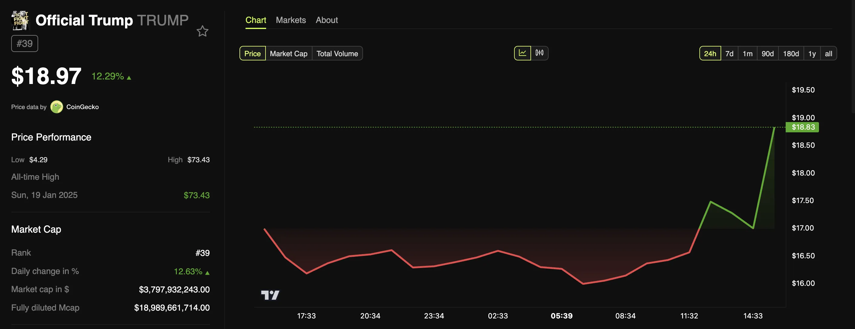 La memecoin se recuperó con un aumento de dos dígitos, subiendo un 12.29% en las últimas 24 horas. Gran parte de estas ganancias se registraron en la última hora. Al momento de la publicación, TRUMP se negociaba a 18,97 dólares. Sin embargo, sigue siendo 75,90% más bajo que su máximo histórico de 73,43 dólares. Mientras tanto, el mercado general de PolitiFi ha estado teniendo un buen desempeño.