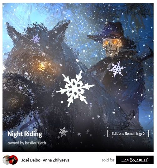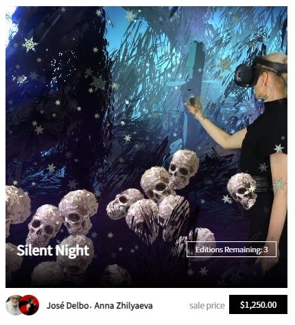 La colección “A Touch of Death” de José Delbo subastada en MakersPlace consta de varias obras. La primera, “Night Riding” (Cabalgata nocturna, en español) consiste en la recreación de un antiguo cementerio en San Petersburgo, con criptas del Siglo XVIII rodeadas de árboles y al fondo un jinete oscuro a la luz de la Luna. La obra fue vendida en 2,4 ETH (5,230.13 dólares).