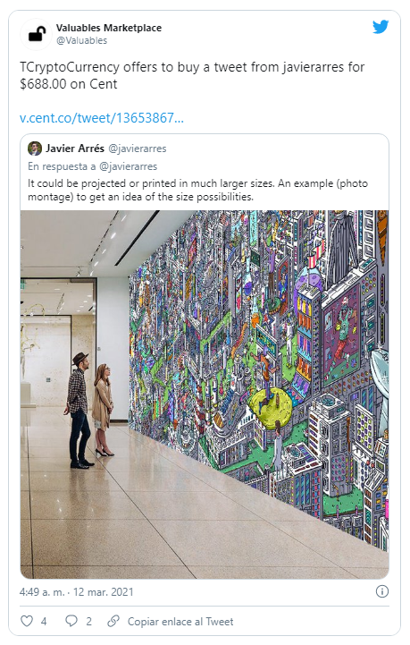 El viernes 12 de marzo, el artista digital español Javier Arrés vendió 2 tweets en tokens no fungibles (NFT) por un valor superior a 1,300 dólares.