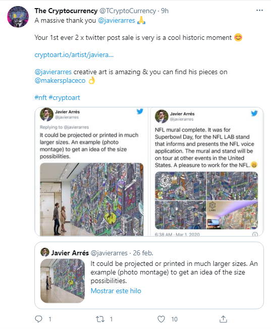El comprador de las obras, conocido en Twitter como @TCryptoCurrency también aprovechó el momento para agradecer a Javier Arrés y a Valuables por lo que consideró un “momento histórico y genial”.