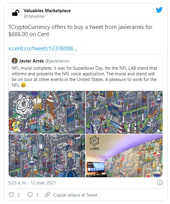 El primer tweet en NFT vendido por Arrés fue un mural relacionado con el Súper Bowl de la NFL y, como afirma el artista en la publicación: