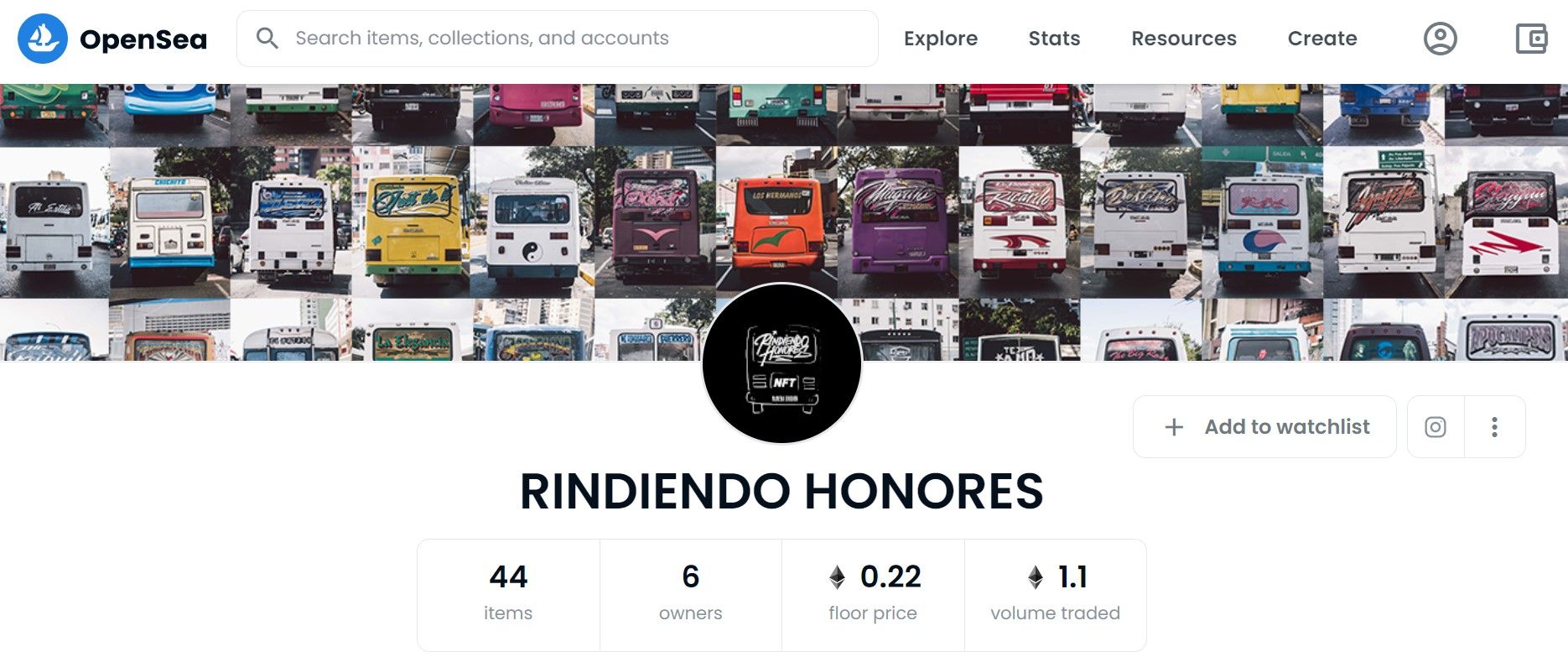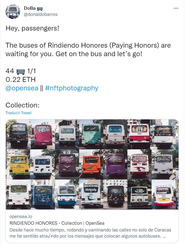 En medio de este boom, varios artistas latinoamericanos han apostado por ellos para así seguir adaptando su obra a estos nuevos mundos. Uno de estos artistas es el reconocido fotógrafo venezolano, Donaldo Barros, que este año ha sacado su colección de NFT, “Rindiendo Honores”, una serie de fotografías donde retrata uno de los paisajes urbanos característicos de Caracas, los mensajes que están en el vidrio trasero de los autobuses.
