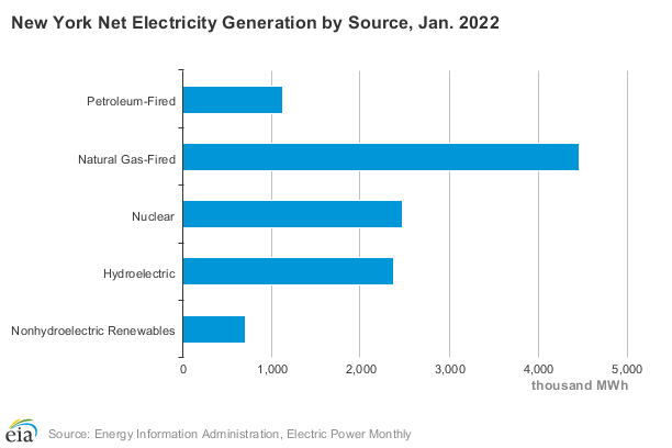 Los datos muestran que la mayor parte de la generación de electricidad en el estado de Nueva York proviene del gas natural, la energía nuclear y la hidroelectricidad.