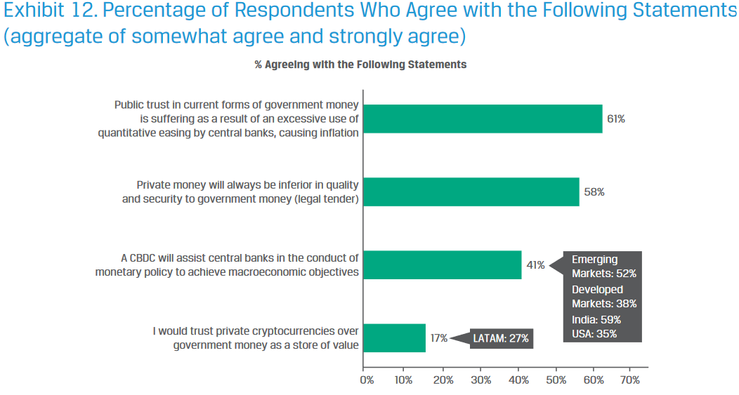 “A nivel global, la cuestión de si lanzar una CBDC no logra obtener un mayor apoyo, con 42 % a favor, 34 % en contra y una proporción notable, 24 %, sin expresar opinión, demostrando nuevamente que las monedas digitales aún no son un concepto maduro.”