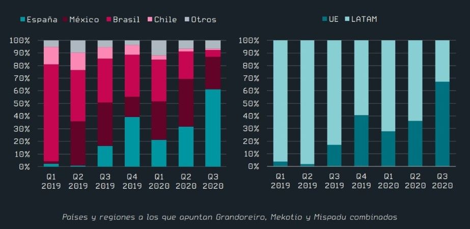 De acuerdo con las teledetecciones de ESET, un poco más del 60% del total de campañas de Grandoreiro, Mekotio y Mispadu se dirigieron a España en el tercer trimestre del 2020, y menos del 10% de los ataques fueron detectados en Brasil.