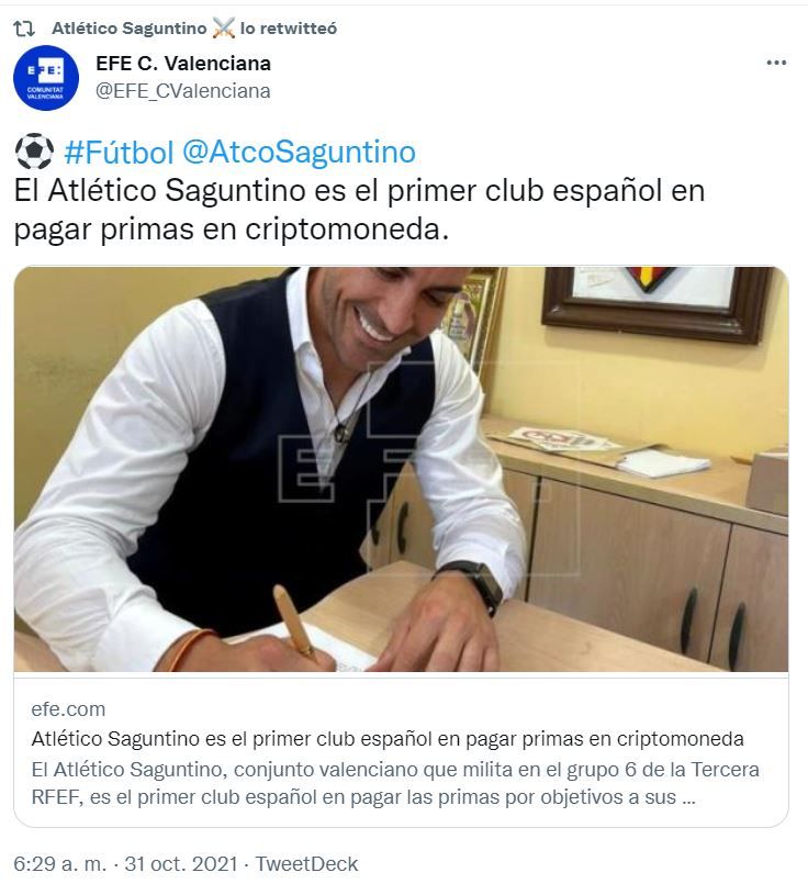 El Atlético Saguntino, club que juega en el grupo 6 de la Tercera División de España RFEF G-VI, anunció que desde hace semanas comenzó a pagar a sus futbolistas con la criptomoneda ZOE Cash, misma que es utilizada para abonar las primas a los jugadores en ligas de ascenso en Argentina.