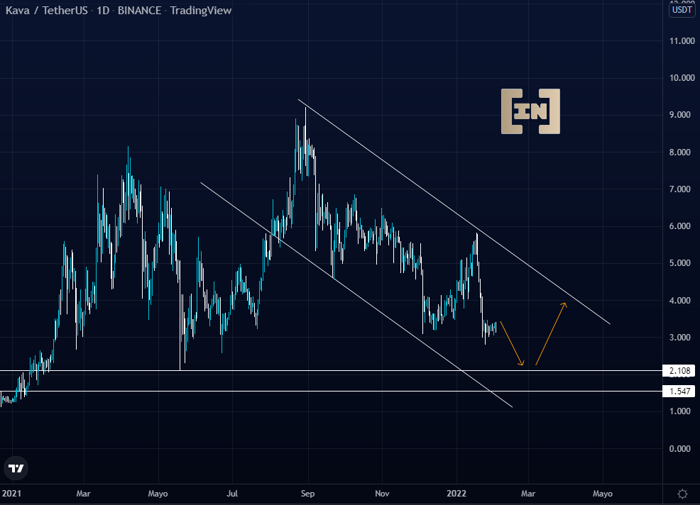 El precio de KAVA continua dentro de un canal descendente. Los últimos días solo ha usado el soporte de los 3 dólares como área de descanso, captura de stops y como absorción de liquidez.