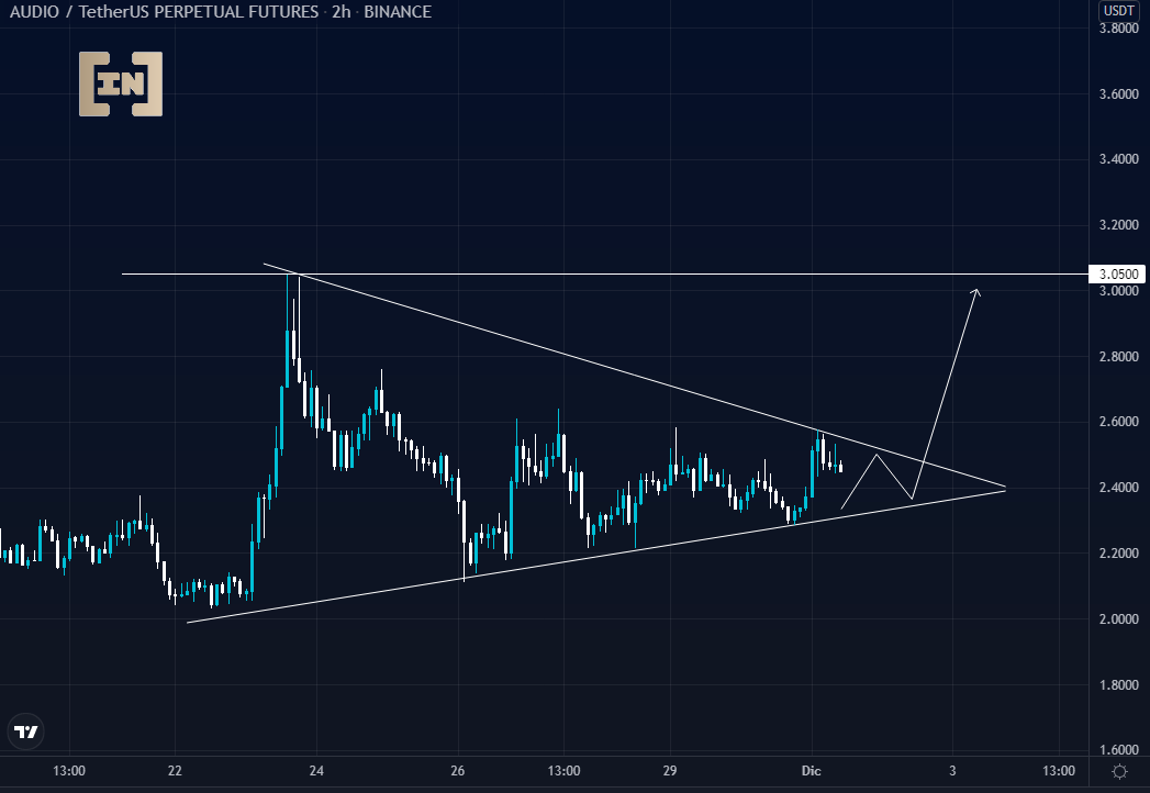 Audius se encuentra dentro de la formación chartista triángulo simétrico, es un patrón de continuación con divergencia alcista. Los máximos decrecientes y mínimos ascendentes sugieren que AUDIO encontró una estabilización en su cotización de mercado por encima de los 2.4 dólares y lo usa como descanso de la tendencia alcista.