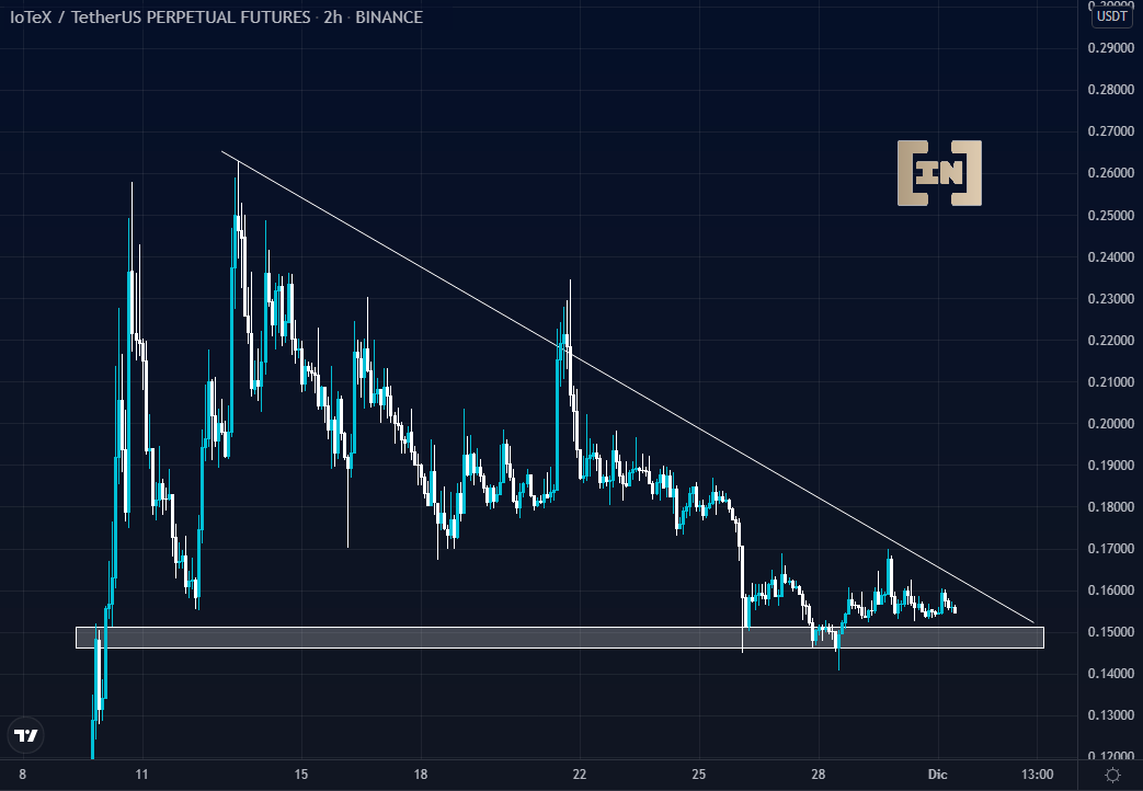 IOTX se encuentra dentro de la formación chartista triangulo descendente, por lo general esta figura tiene un 75% de efectividad de pronosticar una posible ruptura en el soporte, quizá no sea este el caso para IOTX como se puede apreciar en la gráfica. Su precio cada vez se comprime más y ha rechazado en dos ocasiones la ruptura del soporte ubicado en los 0.15 dólares.