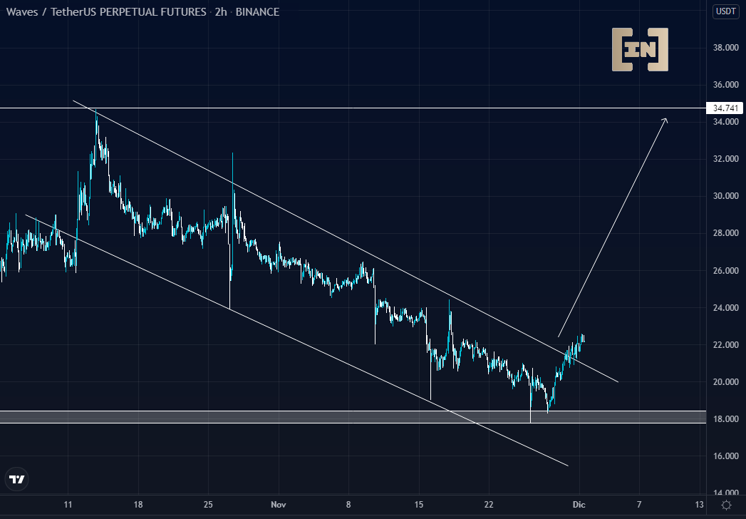 Como se puede apreciar en la figura WAVES ha realizado un precio de cotización sobre el área de soporte ubicado en los 18 dólares. nos indica que los compradores ahora retoman el control del precio y lo empujan a la ruptura del canal.