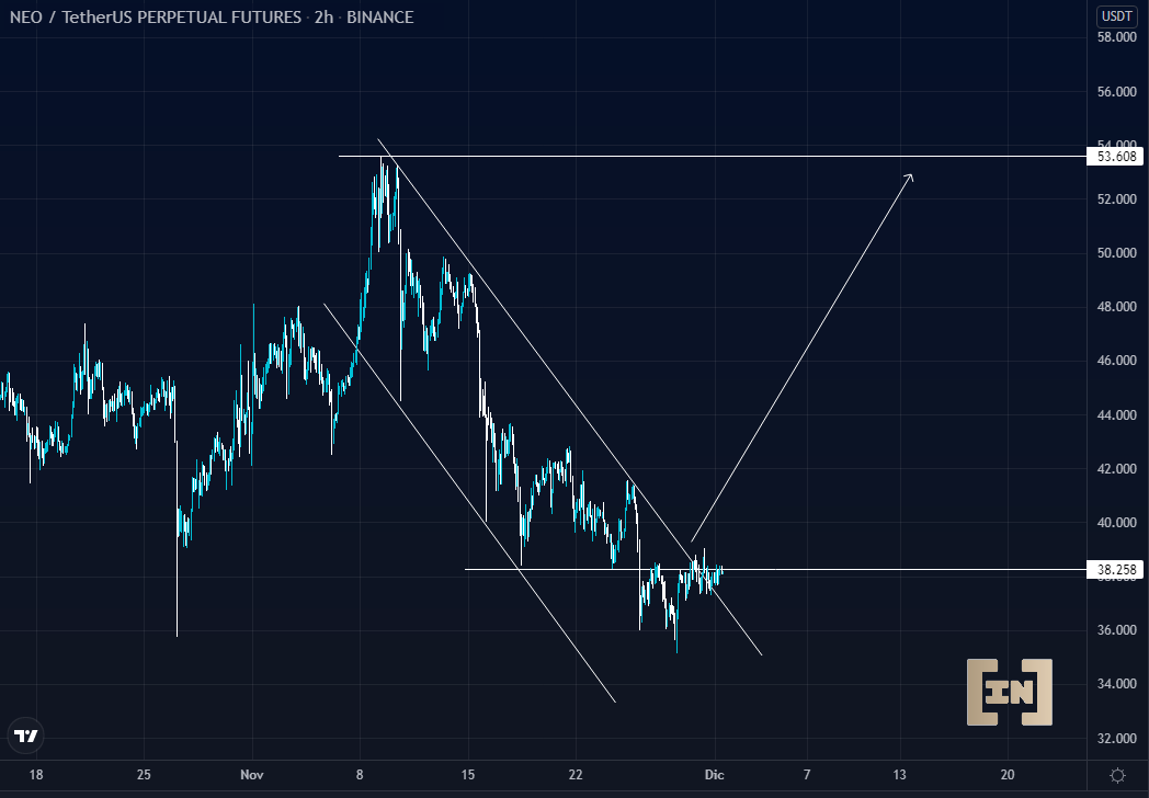 La ruptura en la directriz superior del canal bajista de NEO propone el fin de la tendencia y una estabilización en la cotización sobre los 38 dólares.