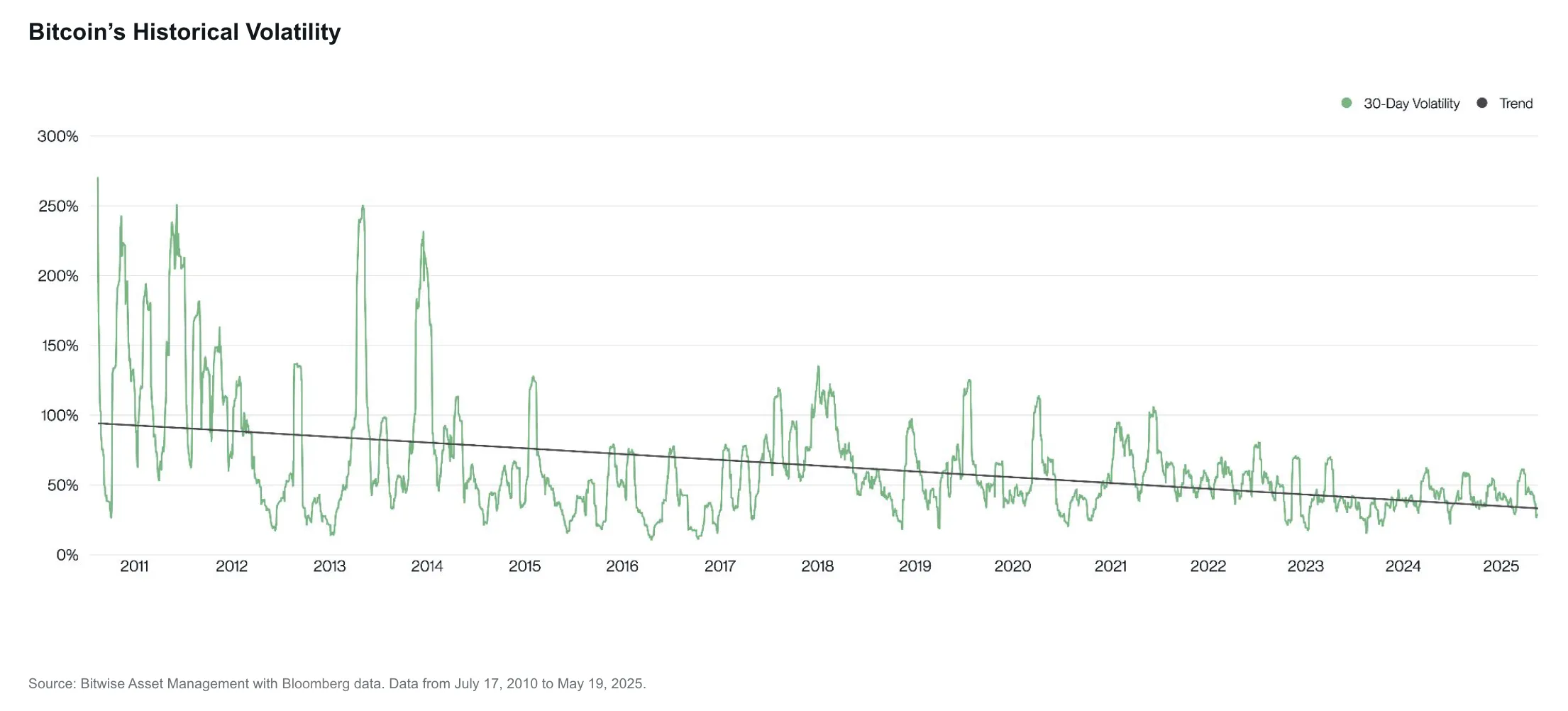 “La volatilidad de Bitcoin ha estado en una tendencia bajista estructural desde el principio. Las razones clave detrás de este descenso estructural son la creciente escasez debido a los halvings y el aumento de la adopción, lo que tiende a amortiguar la volatilidad. Nuestra expectativa es que la volatilidad de Bitcoin finalmente converja hacia la volatilidad del oro y se convierta en un fuerte contendiente como almacén de valor alternativo y activo de reserva”, dijo.