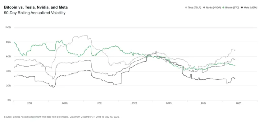 “Un dato particularmente interesante es la volatilidad de Bitcoin en comparación con las principales acciones tecnológicas, como Tesla y Nvidia. Muchos inversores dicen, ‘Nunca invertiría en algo tan volátil como Bitcoin,’ explicó Ryan Rasmussen, Jefe de Investigación en Bitwise, y agregó, “Al mismo tiempo, la mayoría de los inversores poseen Tesla y Nvidia (ya sea directamente o a través de fondos indexados como el S&P 500 y Nasdaq-100). En los últimos meses, Tesla y Nvidia han sido más volátiles que Bitcoin.”