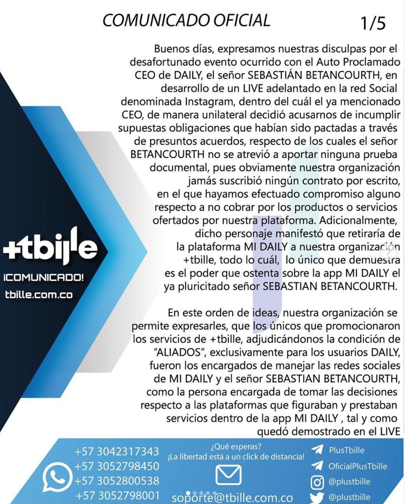 Ante estas declaraciones, tbille publicó en su cuenta oficial de Instagram sus declaraciones, asegurando que Betancourt miente, y que su organización no firmó ningún tipo de contrato con Mi Daily.