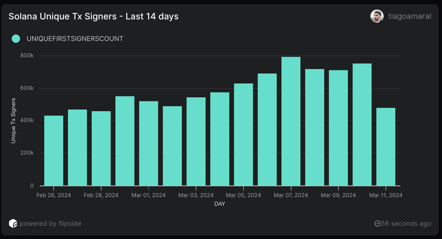 Este número no ha dejado de crecer desde enero de 2024. El 26 de febrero, esa métrica registraba 432,000 usuarios. El 7 de marzo, aumentó a casi 800,000, un crecimiento del 85%. Ese crecimiento en menos de un mes es digno de mención para una blockchain ya tan grande como Solana.