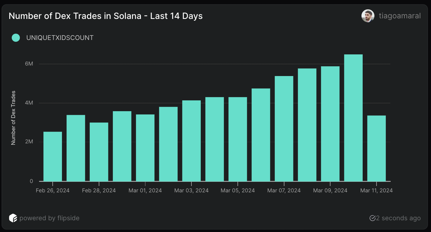 Los datos on-chain de Solana nos muestran dos métricas interesantes. El primero es el asombroso número de operaciones en DEX, que alcanzó los 6,5 millones el 10 de marzo.