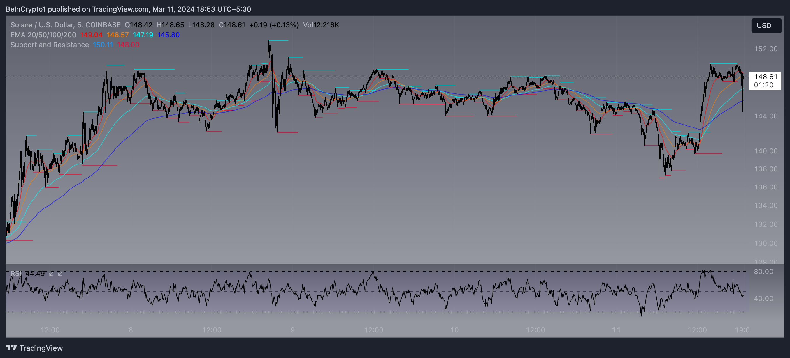 Solana (SOL) presenta un nivel de resistencia de 150 dólares y un umbral de soporte de 148 dólares. Estos niveles críticos han sido identificados en base a los movimientos históricos de precios donde Solana se ha encontrado constantemente con una resistencia significativa de compra o venta.