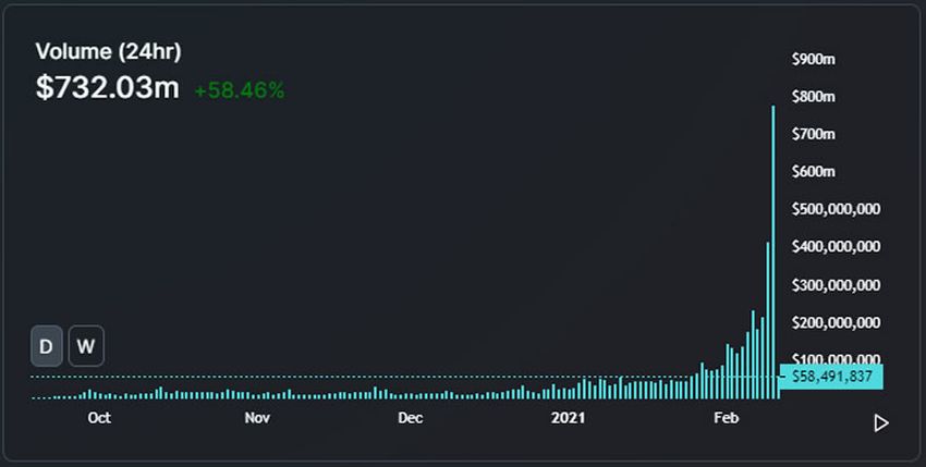 Desde el lunes 8 de febrero, el volumen de trading diario en el DEX ha aumentado un 350%, de alrededor de 167 millones a más de 745 millones de dólares, según CoinGecko.
