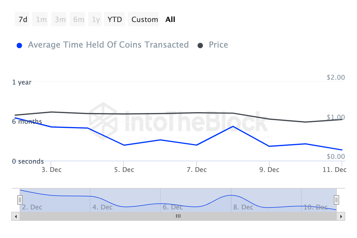 Sin embargo, hay dos razones principales por las que este aumento de precio de Cardano podría no durar. Primero, el tiempo de holding de los tokens de transacción ha disminuido significativamente.