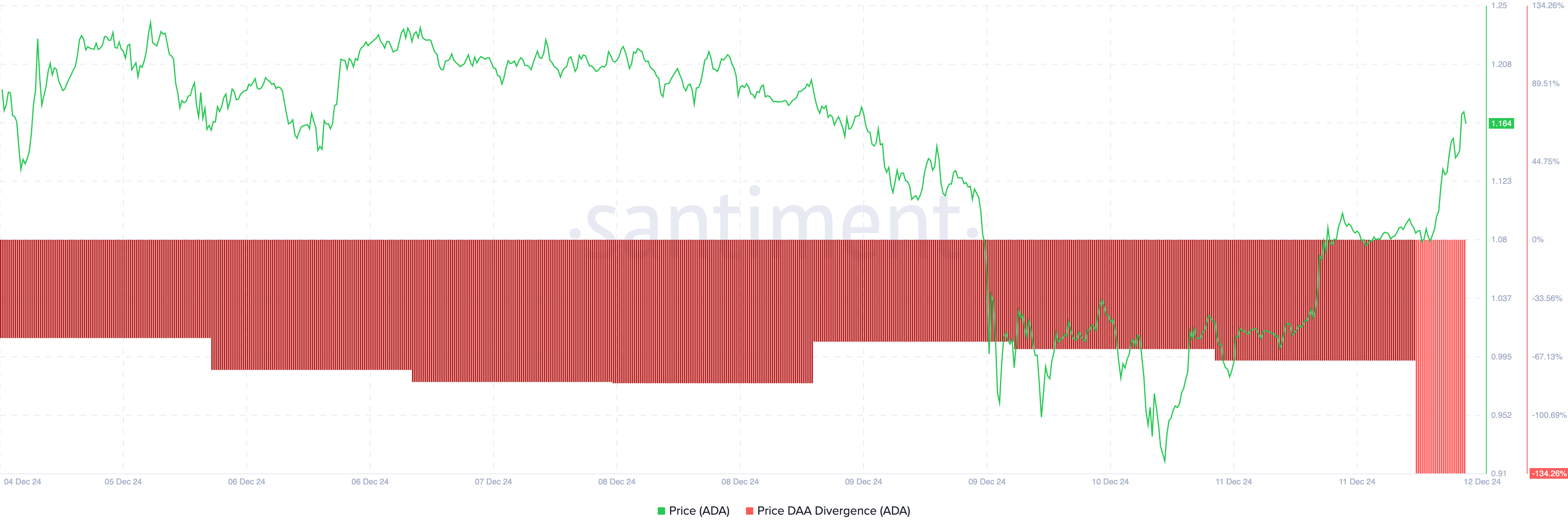 Sin embargo, los datos de Santiment muestran que la divergencia precio-DAA de Cardano ha caído un 134.26%. Esto indica que, mientras el precio de ADA aumentó, las direcciones activas disminuyeron — una señal bajista que sugiere que el rally puede carecer de apoyo. Como resultado, ADA podría enfrentar un posible retroceso.