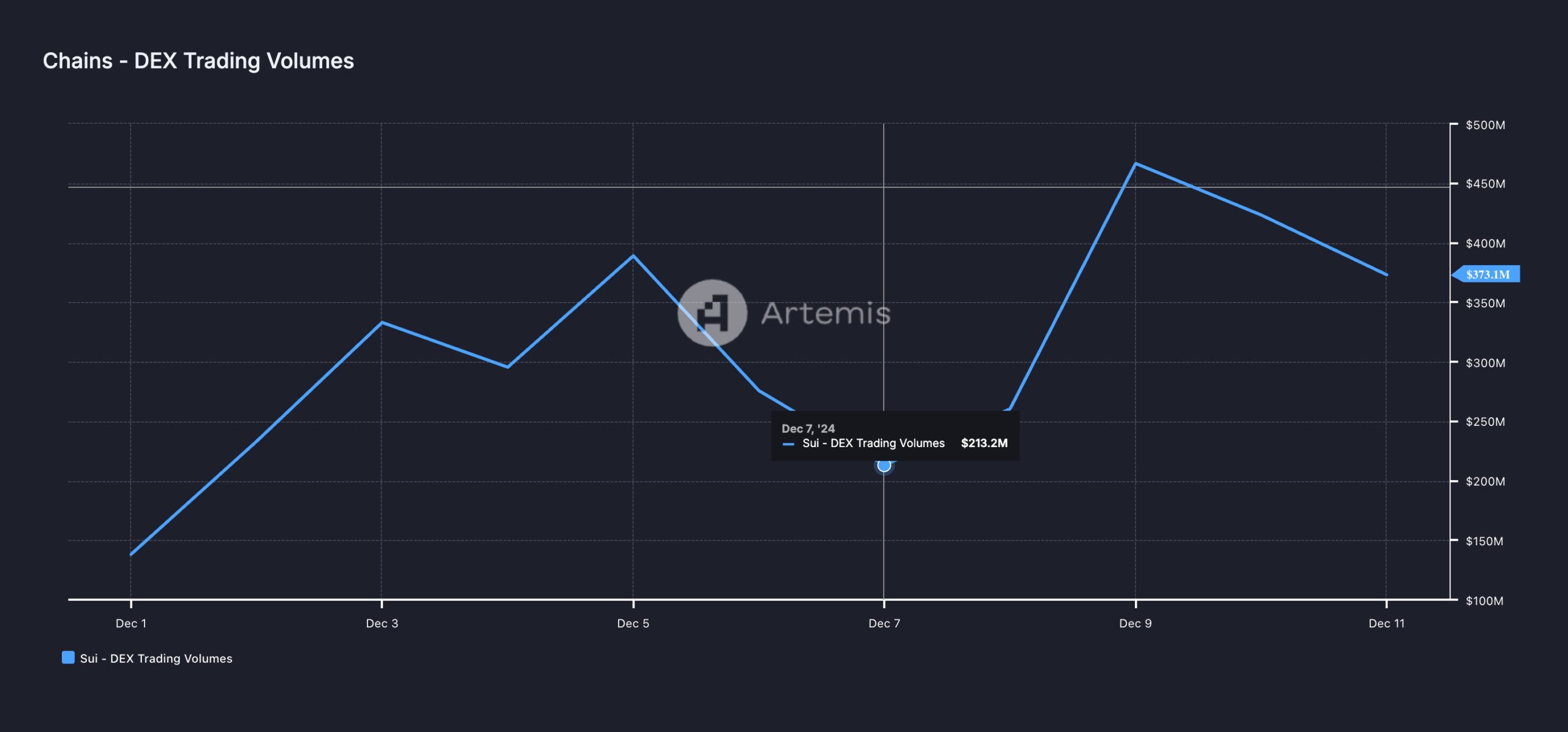 Además de su creciente TVL, el volumen del exchange descentralizado SUI también ha aumentado. En un post en X, SUI dijo que su volumen total de DEX había establecido un nuevo récord de 24 horas. Según los datos de Artemis, el volumen de DEX de la red ha aumentado un 170% desde principios de diciembre.