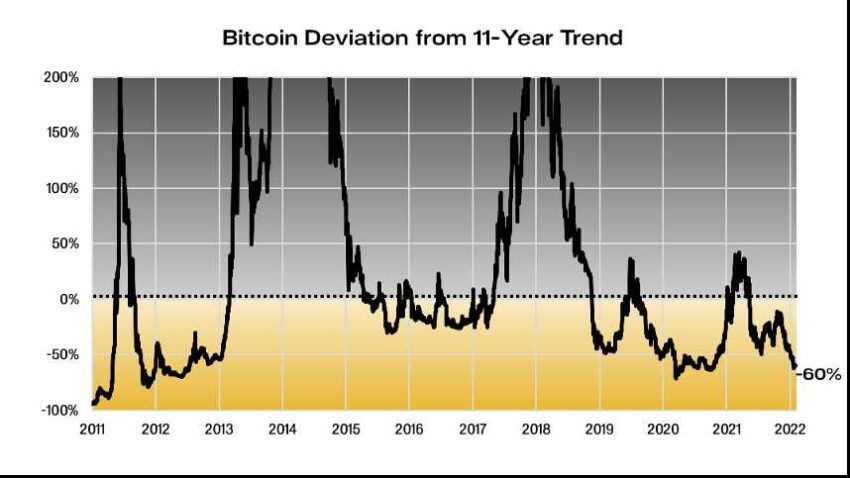 Mostró que el precio de Bitcoin se cotiza actualmente en un 60% por debajo de su tendencia de 11 años, lo que significa que “las probabilidades son realmente altas de que los mercados estén en un extremo y se recuperen relativamente rápido”.