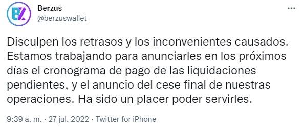 Por un tiempo, todo fue viento en popa, hasta que el 9 de junio del 2022 anunciaron el cese de sus operaciones en bolívares. En el comunicado publicado en su cuenta en Instagram anunciaron que esto se debía a “razones ajenas a Berzus” y no dieron explicaciones de cómo los usuarios podían retirar sus fondos.