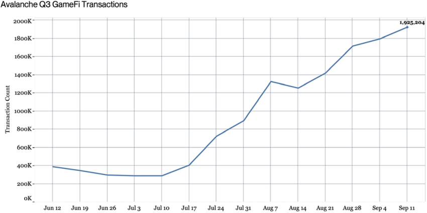 Actualmente, los dos juegos creados en el ecosistema de Avalanche con la mayor cantidad de transacciones son DeFi Kingdoms y Chikn. El recuento de transacciones ha estado creciendo constantemente desde principios de junio y actualmente es de casi dos millones.