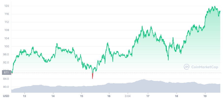 Durante la mañana del sábado 20 de noviembre registró un nuevo máximo histórico de 119.95 dólares, lo que representa un crecimiento de más del 9% en las últimas 24 horas.