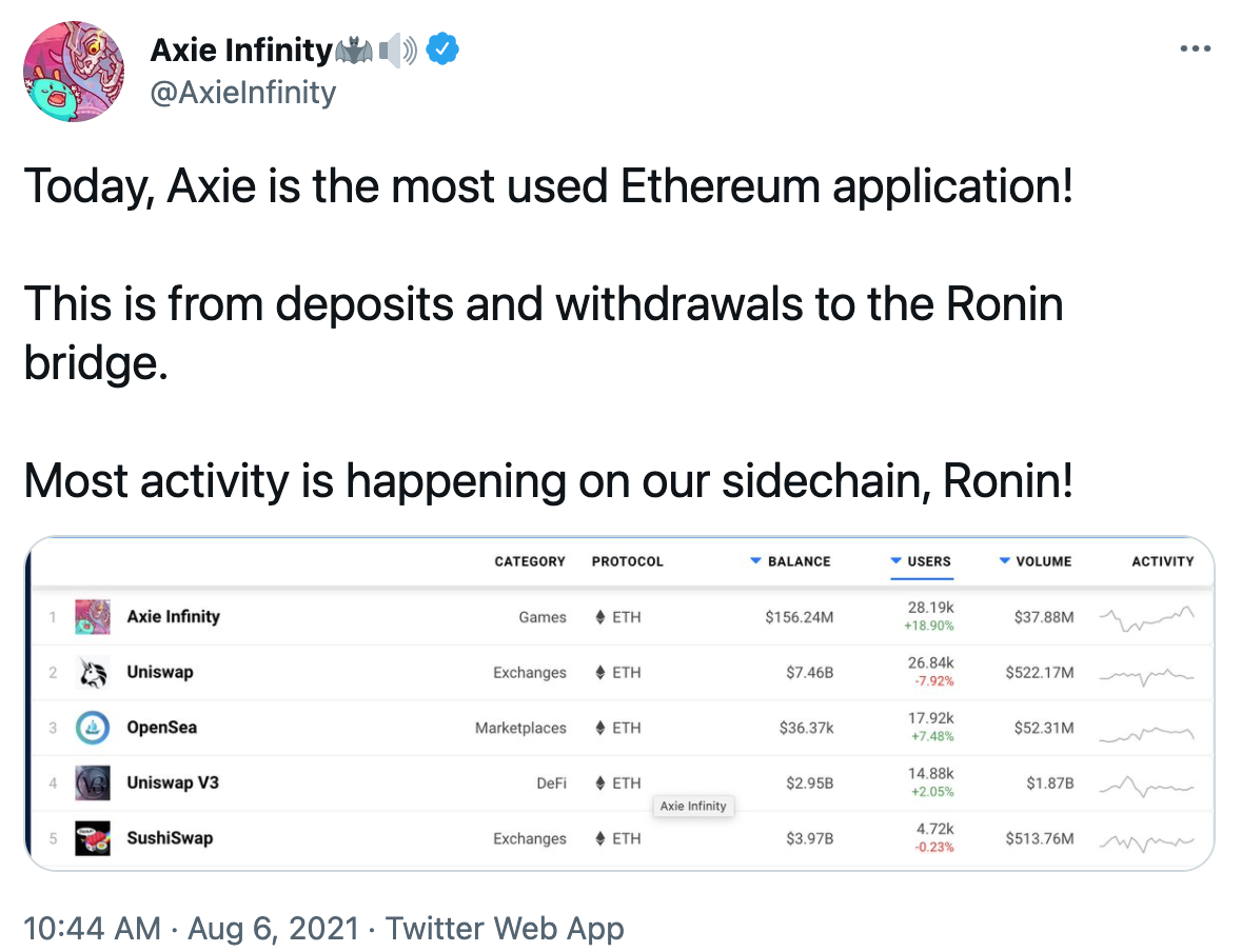 Después de un mes de lucha entre el gigante de las finanzas descentralizadas (DeFi), UniSwap, y entre el gigante de los videojuegos online basado en NFT’s y blockchain, Axie Infinity, ha llegado el sorpasso posicionando a Axie Infinity como el líder en actividad dentro de la red de Ethereum según DappRadar y así se celebró desde su cuenta oficial de Twitter.