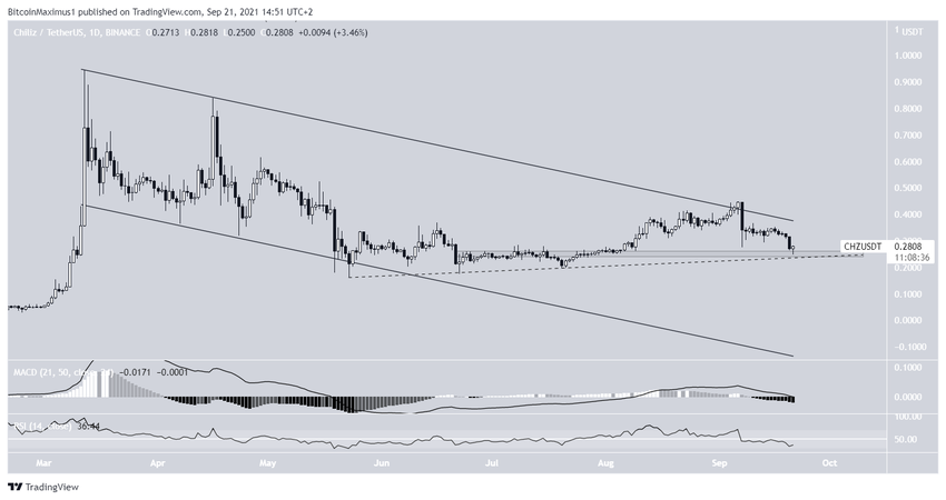 CHZ ha estado cayendo junto con un canal paralelo descendente desde que alcanzó un precio máximo histórico de 0,945 dólares el 12 de marzo. Dichos canales generalmente contienen estructuras correctivas, que eventualmente conducen a rupturas.