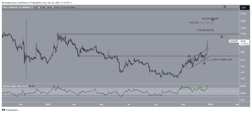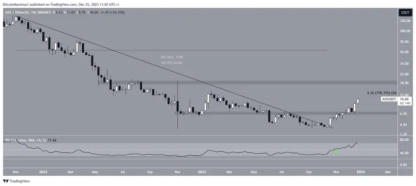 El precio de AXS ha aumentado desde octubre, cuando rompió una línea de tendencia de resistencia descendente a largo plazo. Antes de la ruptura, la línea de tendencia se había mantenido vigente durante más de 700 días, concretamente desde el máximo histórico de noviembre de 2021.