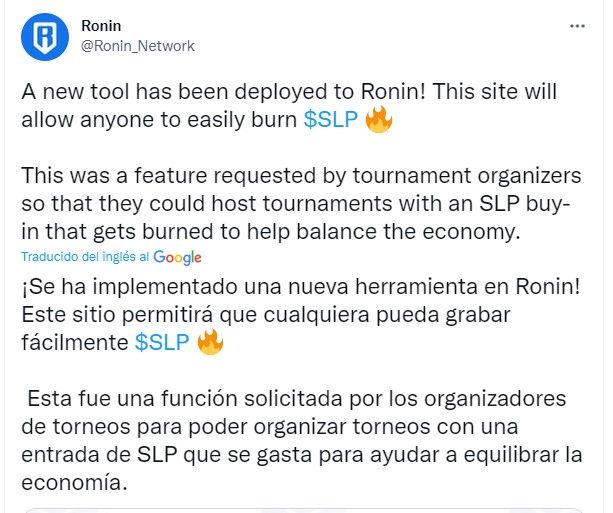 Así lo anunció Ronin, al presentar su app de quemado de SLP. El proceso es simple, entras a la app, conectas el monedero de Ronin y quemas el número de SLP que quieras. Simple.