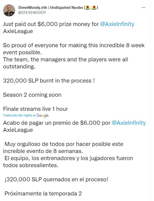 De hecho, ya se supo que un torneo de Axie llamado Axie League será el primer gran torneo en hacer una quema cuando quemen 320 mil SLP para cerrar el torneo tras 8 semanas de competición.