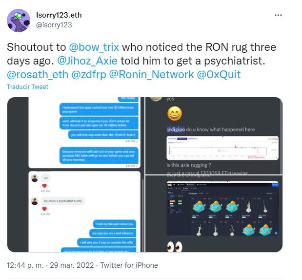 Había un dato que se ha repetido muchas veces en las redes y era la fecha en la que se realizó el hack. Y es que muchos usuarios habían reportado con días de antelación que estaba sucediendo algo extraño en los puentes de Ronin y los supervisores no estaban actuando con tiempo.