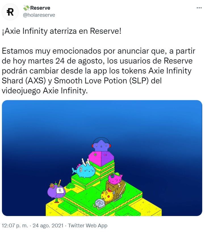 El exchange de criptomonedas Reserve anunció la integración de los tokens de AXS y SLP a su plataforma, los cuales serán intercambiables por monedas locales y criptomonedas. Las empresas anunciaron un programa de becas para usuarios de Venezuela, Colombia y Argentina.