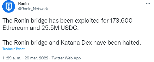 En el ataque reciente a Ronin, el equipo desarrollador señaló en una publicación de blog minutos después del suceso: