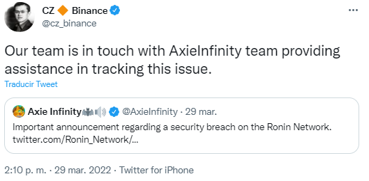 “Nuestro equipo está en contacto con el equipo de Axie Infinity para brindar asistencia en el seguimiento de este problema”.