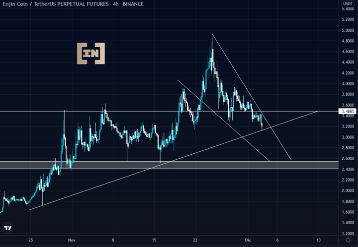 ENJ ha venido formando una cuña descendente desde los 4.8 dólares, un punto fuerte de cotización para los vendedores. La formación de dicha cuña aun se ve muy joven, tanto el banderín como el gallardete (línea inferior de la cuña) deben presentar mínimo dos toques para crear ruptura en la cuña.