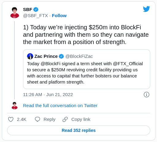 FTX Trading Ltd. supuestamente está proporcionando líneas de crédito para tratar de contener la caída de la industria. Ayer, el exchange de criptomonedas BlockFi anunció que obtuvo una línea de crédito renovable de 250 millones de dólares por parte de FTX.