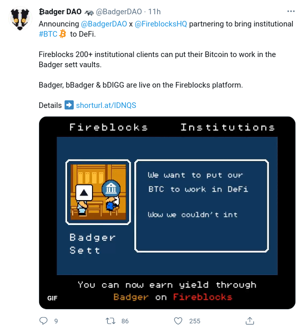 El 9 de abril, Badger DAO declaró en un artículo que la asociación ayudaría a llevar Bitcoin institucional al ecosistema DeFi. El protocolo de wrapped Bitcoin también tiene como objetivo aumentar su uso entre la creciente base de inversores institucionales.