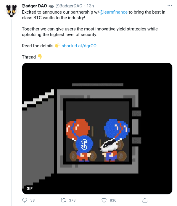 La asociación, anunciada el 11 de febrero, tiene como objetivo llevar la experiencia de vaults sostenibles de Yearn Finance a Badger. Dicha asociación busca asegurar aún más los fondos de los usuarios, dado que Badger continúa introduciendo más vaults protegidos, mantenidos y desarrollados por Yearn para sus usuarios.