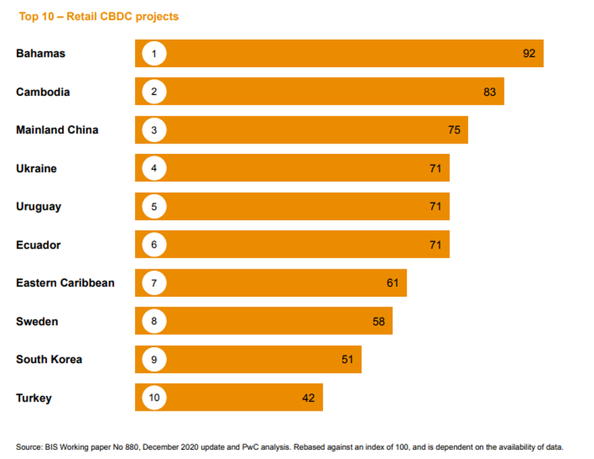 China ocupa el tercer lugar, seguida de Ucrania, Uruguay y Ecuador. Como es evidente, las CBDC de mayor rango provienen de economías en desarrollo. Además, PwC afirma que “la inclusión financiera y la digitalización aparecen como impulsores clave” para estos países.