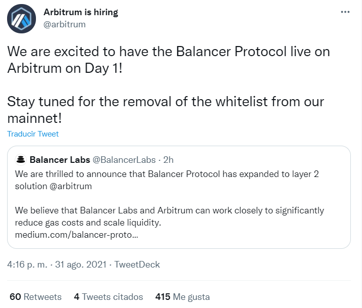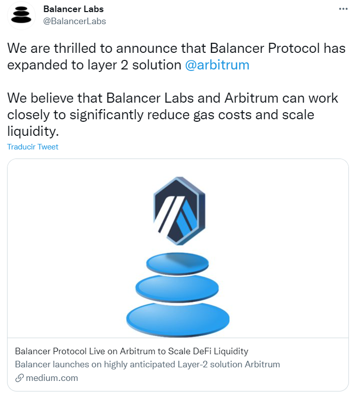 Mediante las redes sociales oficiales de Balancer y Arbitrum se ha dado a conocer la alianza e implementación de la mejora, Balancer Protocol ha lanzado soporte en la solución de escalabilidad de Capa 2 Arbitrum para reducir significativamente los costos del gas y escalar la liquidez.