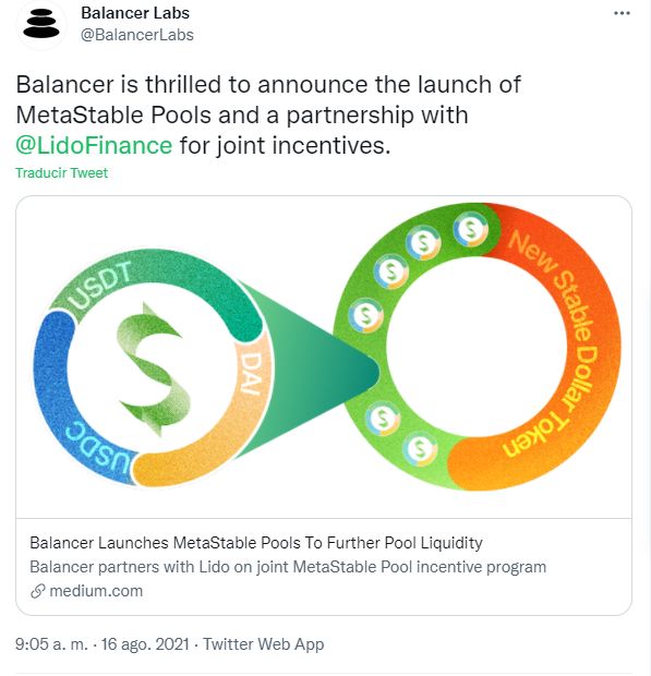 SponsoredEn las redes oficiales de Balancer se realizó un anuncio importante: su alianza con Lido Finance para potenciar los depósitos en stablecoins a través de pools específicos.