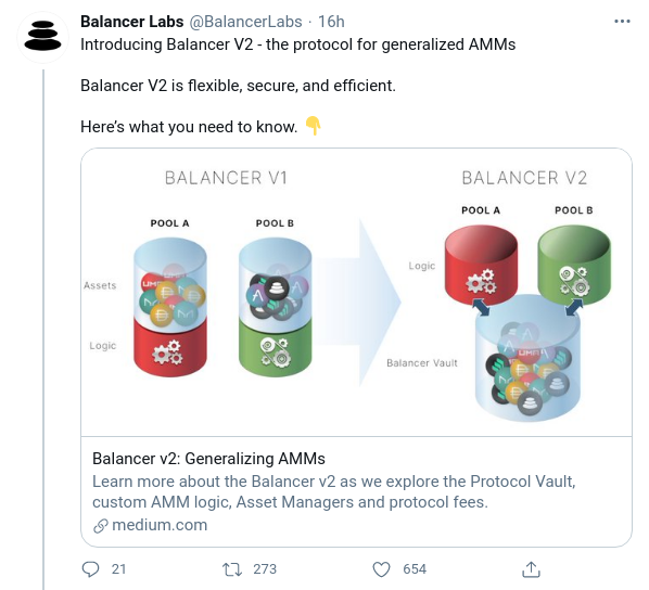 La próxima iteración de la plataforma de préstamos Balancer DeFi, que recibió inversión de capital riesgo en noviembre, incluirá un market maker (creador de mercado) automatizado. Será una transición a un único vault que contiene y administra todos los activos añadidos por todos los pools de Balancer.