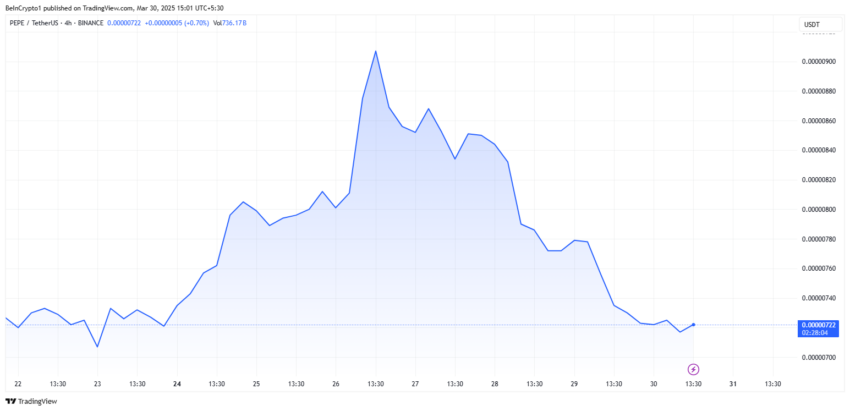 El precio de PEPE ha caído más del 5% en las últimas 24 horas y se negociaba a $0,00000721 al momento de escribir este artículo. Si el precio de PEPE se acerca al punto de liquidación de la ballena, otros traders pueden comenzar a vender preventivamente para evitar pérdidas, creando un efecto de bola de nieve.