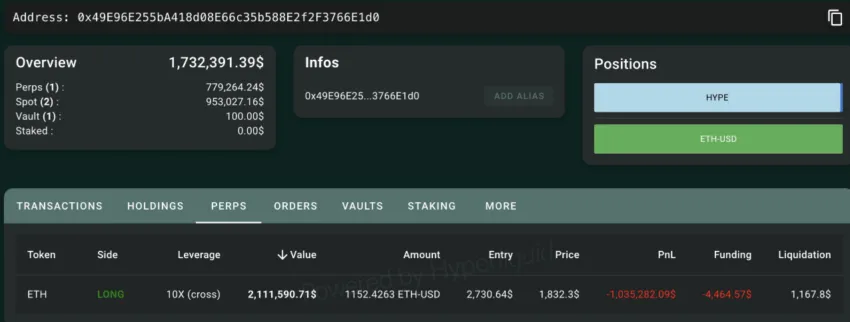 Actualmente, enfrentan una pérdida no realizada de 1,035 millones de dólares debido a un precio de entrada de 2,730 dólares. Dadas las condiciones actuales del mercado, esta cifra ha resultado ser demasiado alta. Sin embargo, a diferencia de la ballena PEPE, este operador tiene un margen de reserva más cómodo, con un precio de liquidación de 1,167.8 dólares.