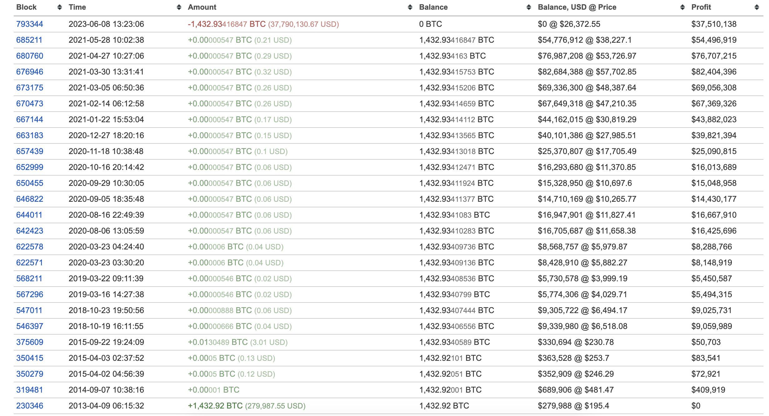 Un monedero con una gran suma de bitcoin transfirió sus 1.432,93 BTC, unos 37,8 millones de dólares con la valoración actual, a una nueva dirección tras más de 10 años de inactividad.