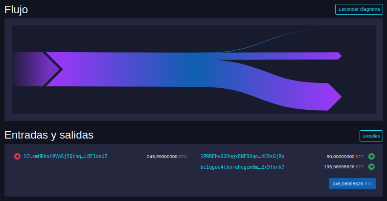 El movimiento realizado el día de hoy fue significativo ya que la ballena utilizó una UTXO de 245.99 BTC. En este sentido, la misteriosa entidad envió 50 BTC a otra dirección heredada y recibió el cambio de 195.98 BTC en una dirección moderna de SegWit.